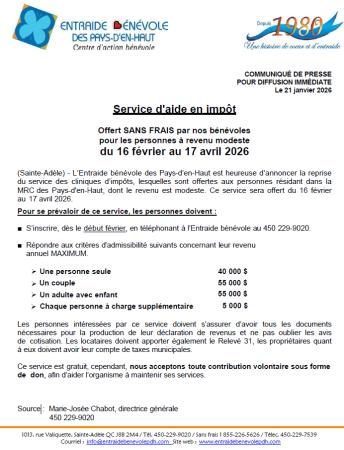 L’Entraide bénévole des Pays-d’en-Haut est heureuse d’annoncer la reprise du service des cliniques d’impôts, lesquelles sont offertes aux personnes résidant dans la MRC des Pays-d'en-Haut, dont le revenu est modeste. Ce service sera offert du 16 février au 17 avril 2026. Pour se prévaloir de ce service, les personnes doivent :